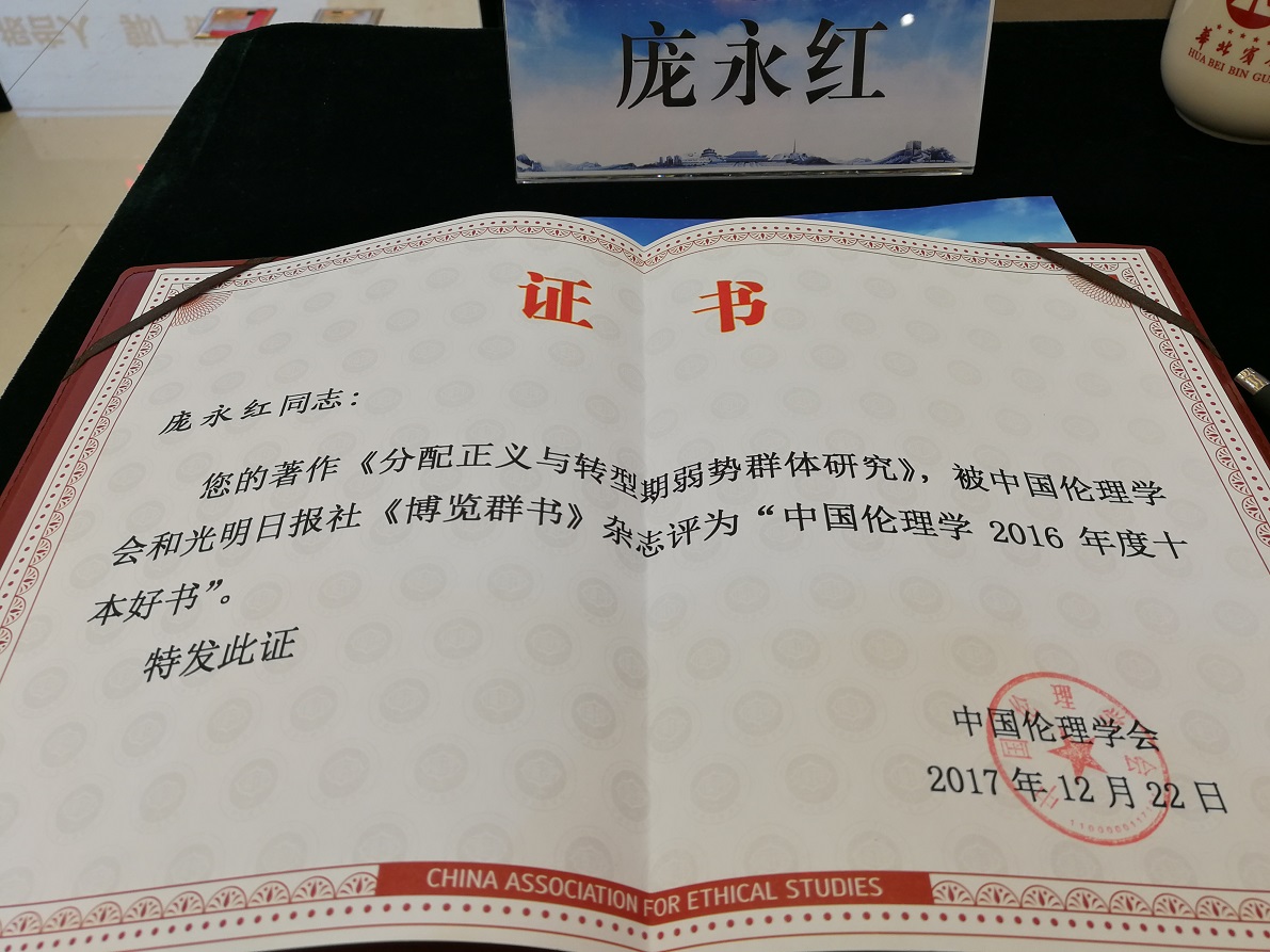 庞永红教授受邀参会,其专著《分配正义与转型期弱势群体研究》被中国伦理学会和光明日报社《博览群书》杂志评为“中国伦理学2016年度10本好书”。