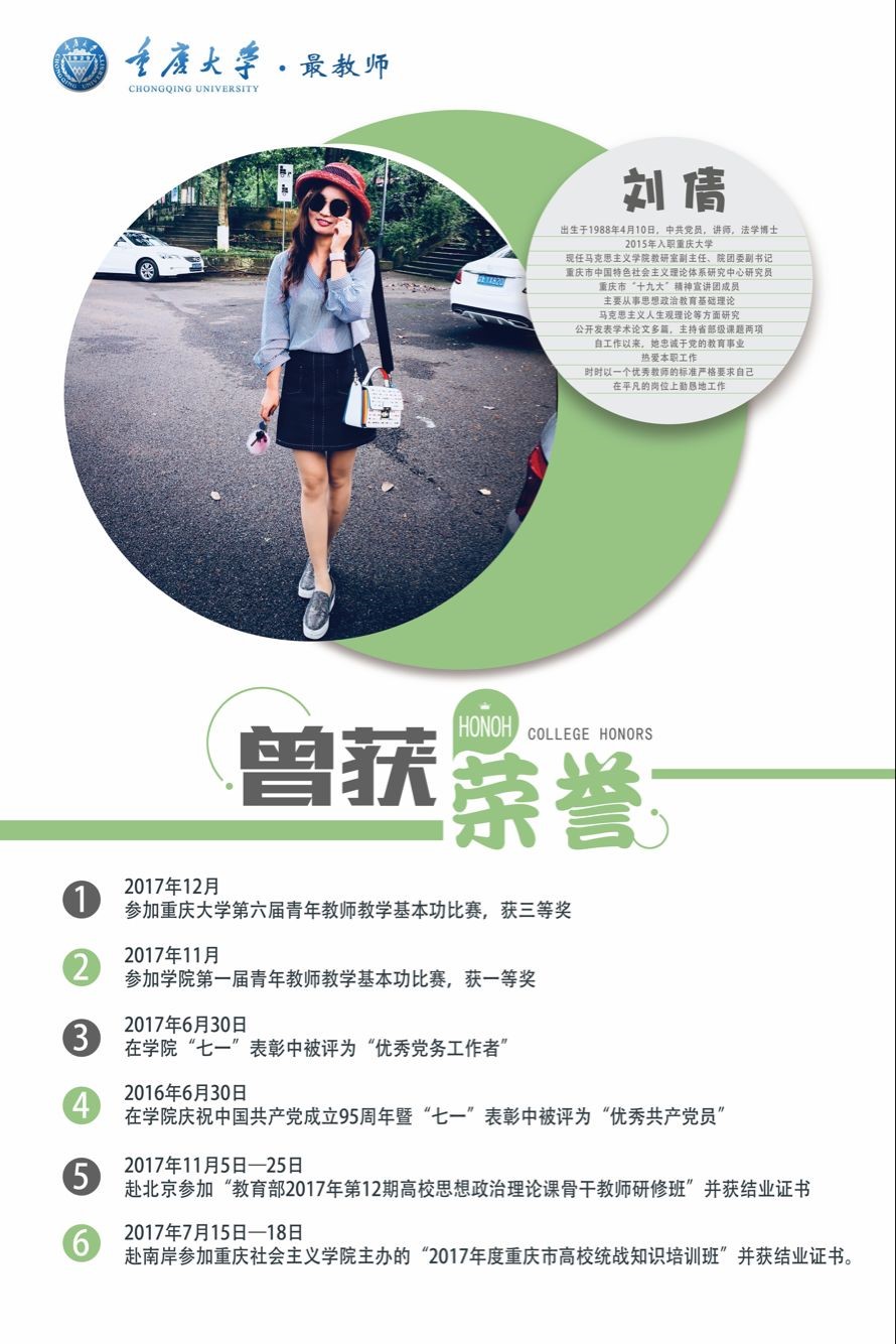 高度重视,在全院范围内征求教师意见,经过多次酝酿与讨论决定选派我院青年教师刘倩参选第六届“最受学生欢迎的老师”评选活动。此次活动经过报名推荐、线上投票、线下宣传、材料评审以及公开展示五个阶段。刘倩老师不负众望,在各个评选环节中名列前茅,进入到公开展示阶段。