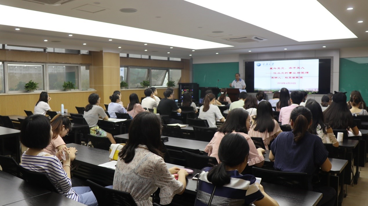 杜承南教授以“大美湘西,人杰地灵;弃武从文,舌犁笔耕;另辟蹊径,开拓创新”32字向同学们介绍了沈从文的文学写作事业,又以“一见钟情,琴瑟和鸣;情陷《边城》,迷茫十年;历经坎坷,处变不惊”32字讲述了一代文豪沈从文的浪漫爱情故事。