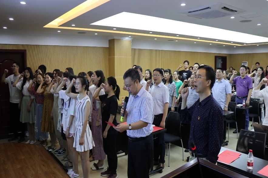 在颁奖之后,张邦辉院长带领学院新党员宣誓,老党员重温入党誓词。新老党员右手握拳,面向党旗,作出庄严承诺。