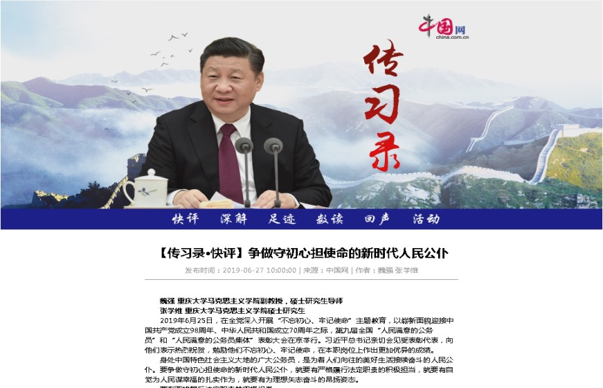 魏强副教授、硕士生张学维合著的时评文章《争做守初心担使命的新时代人民公仆》入选中国网观点库(//www.china.com.cn/opinion/2019-06/27/content_74931090.htm)。文章指出,身处中国特色社会主义大地的广大公务员,是为着人们向往的美好生活接续奋斗的人民公仆。要争做守初心担使命的新时代人民公仆,就要有严格履行法定职责的积极担当,就要有自觉为人民谋幸福的扎实作为,就要有为理想矢志奋斗的昂扬姿态。