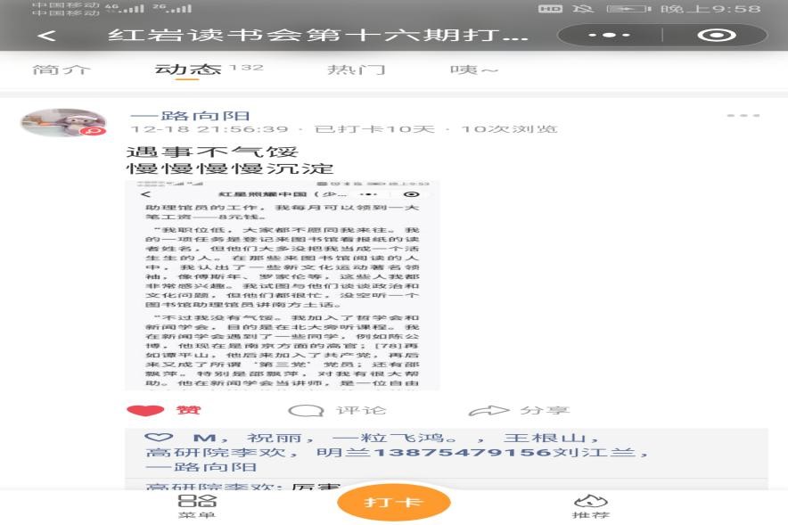线上活动“十二天打卡计划”于2019年12月8日至12月18日展开,报名参与“追忆红色经典悦读会”的同学在推荐书目中择取感兴趣的书籍,坚持在微信小程序—“小打卡”组成的阅读圈里打卡12天,进行每日打卡,留言、评论分享读书感悟。