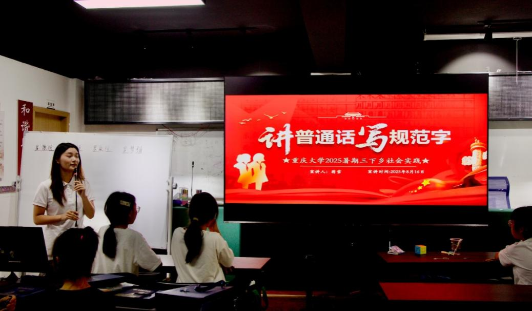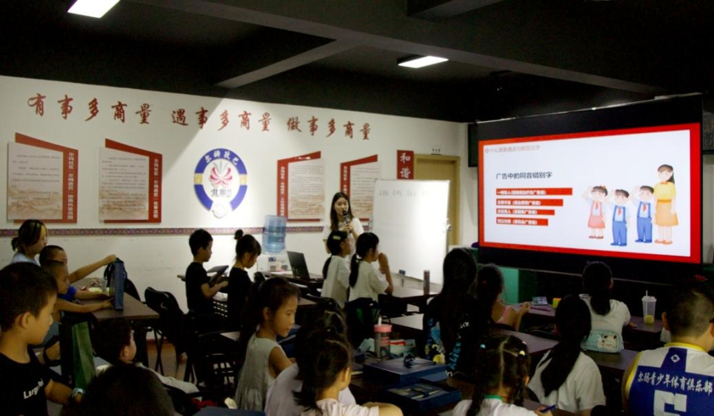 活动伊始,实践团成员蒋雪以“讲普通话,写规范字”为主题进行推普宣讲。通过讲解汉字的起源、演变与构造,引导孩子们从一笔一划中感悟中华文明的悠久历史和先民智慧;通过声情并茂的诗词朗诵,让孩子们沉浸式地体会中华诗词文化的意境之美和语言艺术的精妙之处;通过开展寓教于乐的普通话知识竞赛,将普通话语音、词汇、语法规范融入趣味游戏环节,让社区儿童在欢声笑语中体会语言魅力。