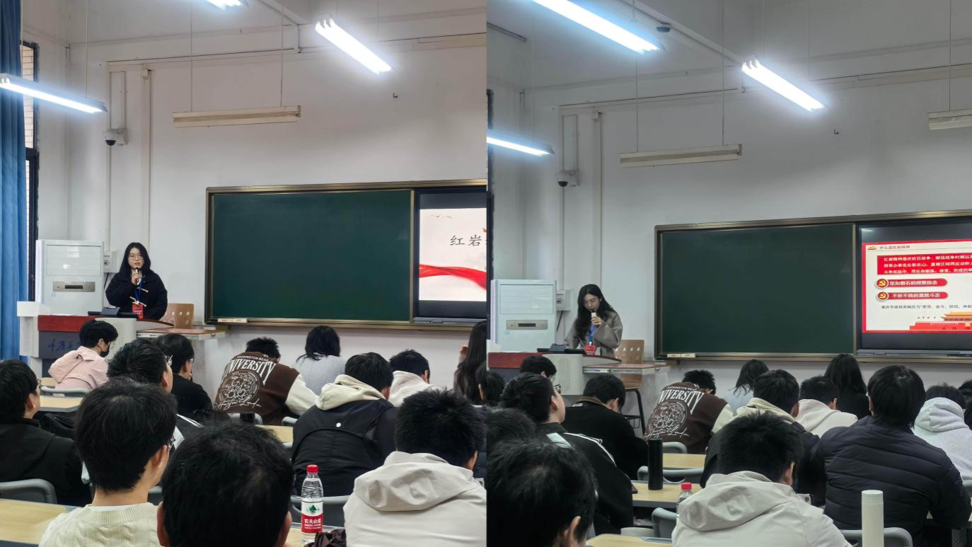 活动开场播放《巴蜀百年红色文化》短视频。渣滓洞、白公馆的实景画面与江姐、刘国鋕等先烈的坚贞事迹交相辉映,瞬间将同学们带回那段风雨如磐、信念如炬的峥嵘岁月,使大家深切感受先辈的崇高气节。红岩宣讲团三位讲师依次登台。首讲的谭冰洁以红岩精神历史脉络为主线,阐释其“忠诚坚定、不畏艰险”的核心内涵。她通过王朴变卖家产支援革命、为子取名“继志”等史实,激励机械学子从红岩精神中汲取力量,以敢于斗争、善于创造、团结协作的姿态,勇破高端制造领域的技术封锁。