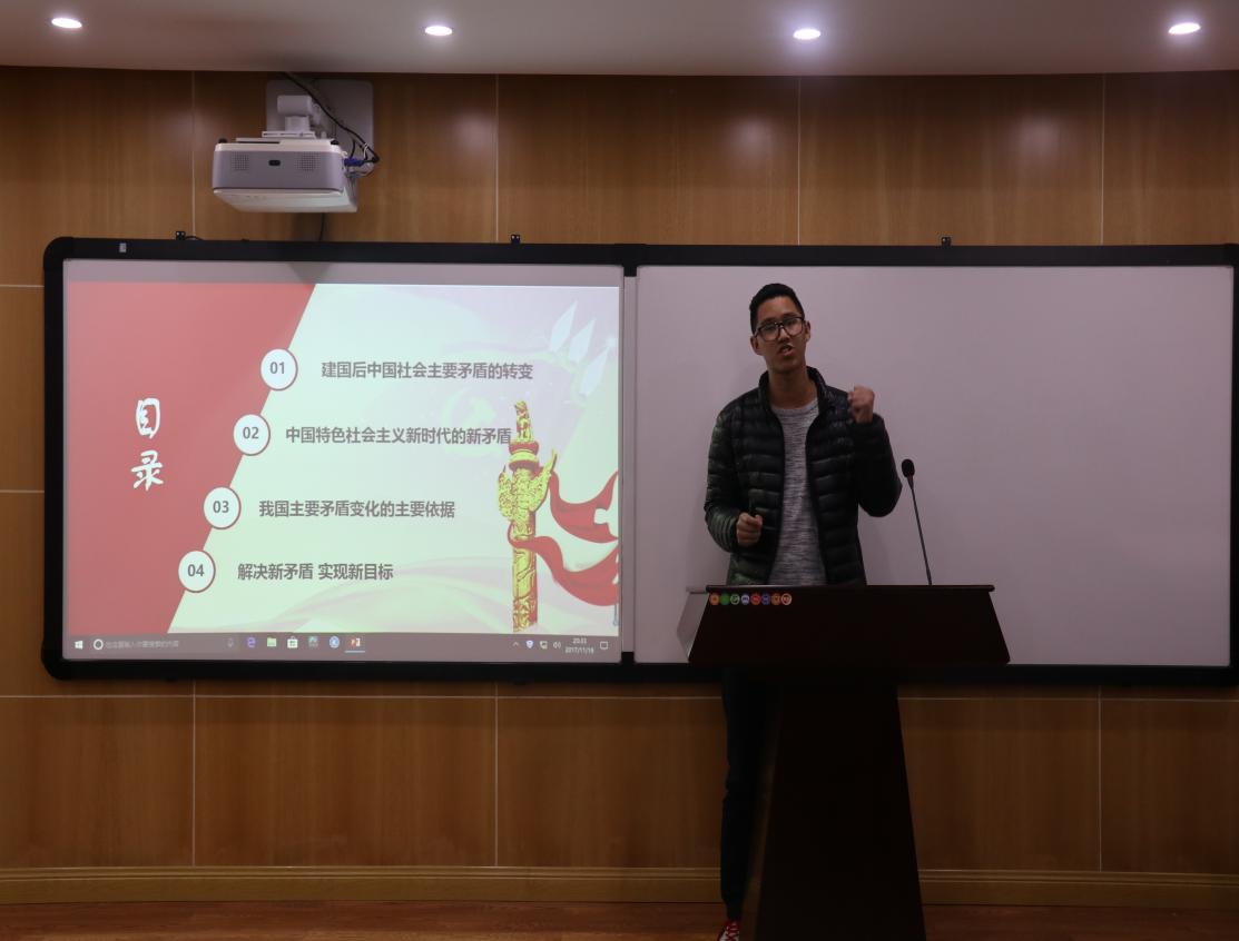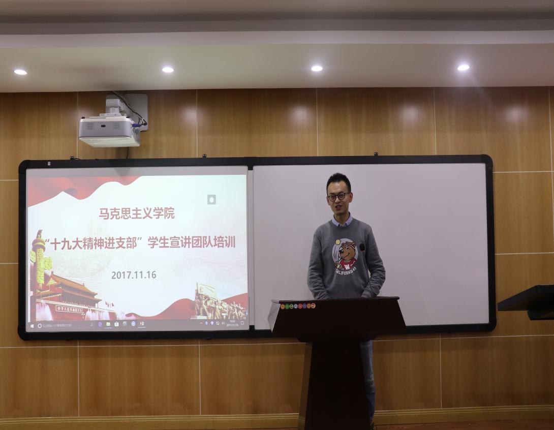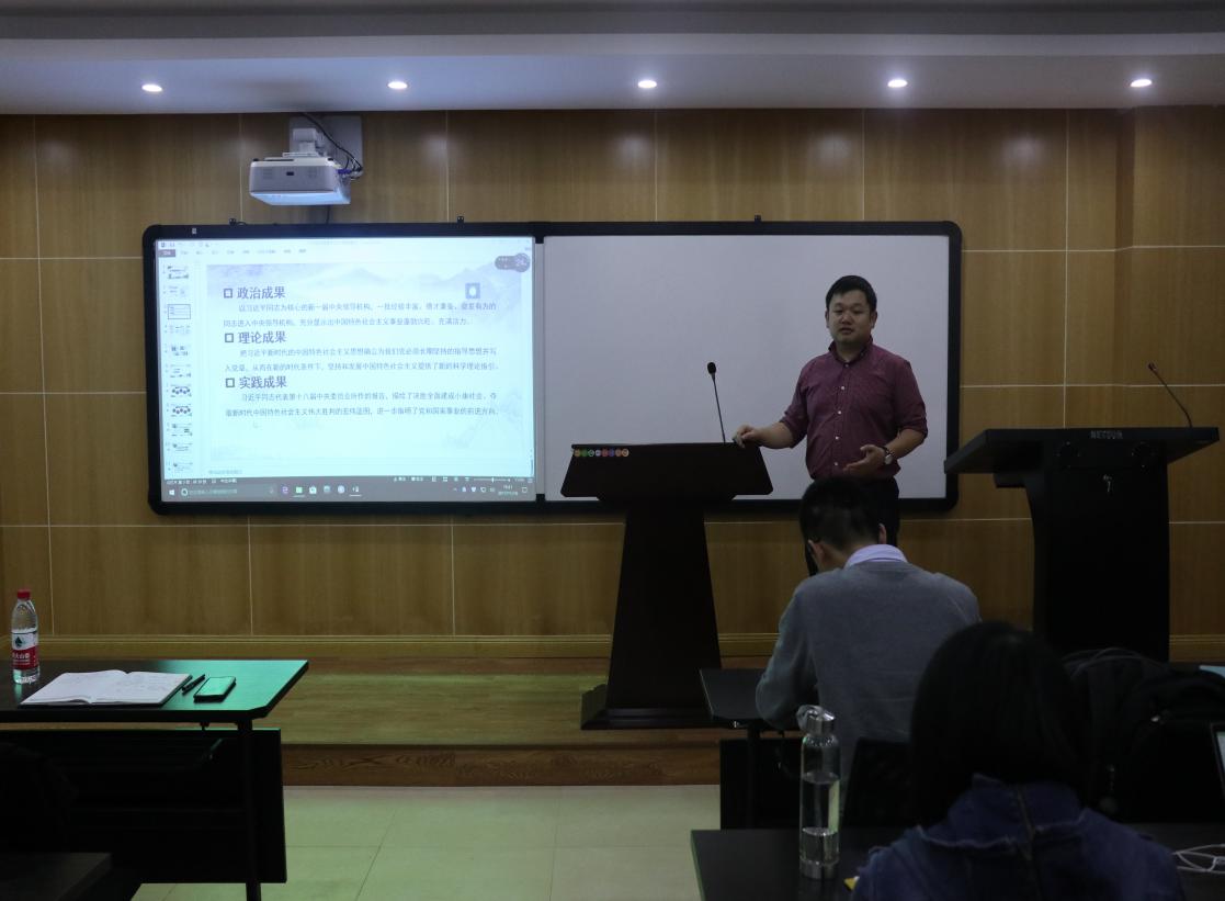 杨华老师首先围绕如何更好地宣传十九大精神提出了具体而明确的要求。他指出,要坚持良好的政治素养和理论修养,结合专业知识对十九大讲话精神进行深入解读,要从细处、实处出发,结合身边实际将宣讲内容有效地表述出来,做一场既生动又有吸引力的宣讲。在具体宣讲内容方面,杨老师向大家分享了三个方面的内容:一是对十九基本情况的简单概述,如召开时间、与会代表、所取得的政治、理论、实践成果等;二是对十九大的内容进行概括,包括新时代、新思想、新起点、新征程的具体内涵;三是就其中一个具体的内容展开论述,发表自己的观点和看法。只要把握好框架、背景、重点内容,一定能让大家对十九大精神领会深、领会透。此后,所有参加宣讲的成员依次上台进行五分钟的试讲,接受大家的批评建议,以提高宣讲水平。