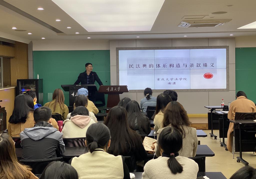 谢潇副教授从“何为法典”入题,阐释了世界立法史中法典的溯源以及演变,分析了我国《民法典》出台独特的历史意义与重大影响。随后谢老师将“我国民法典的体系构造”这一部分展开了详细的叙述,依次论述了“总则”、“物权”、“合同”、“人格权”、“婚姻家庭”、“继承”、“侵权责任”等七部分内容,向在座的师生们全方位、立体化、完整性地构建了我国《民法典》的基本框架。谢潇副教授在讲述过程中,引经据典、风趣幽默,结合中外法学家的研究经历、论争过程,列举大家日常生活中所遇到的实际法律案例,为大家带来了生动的法律一课。