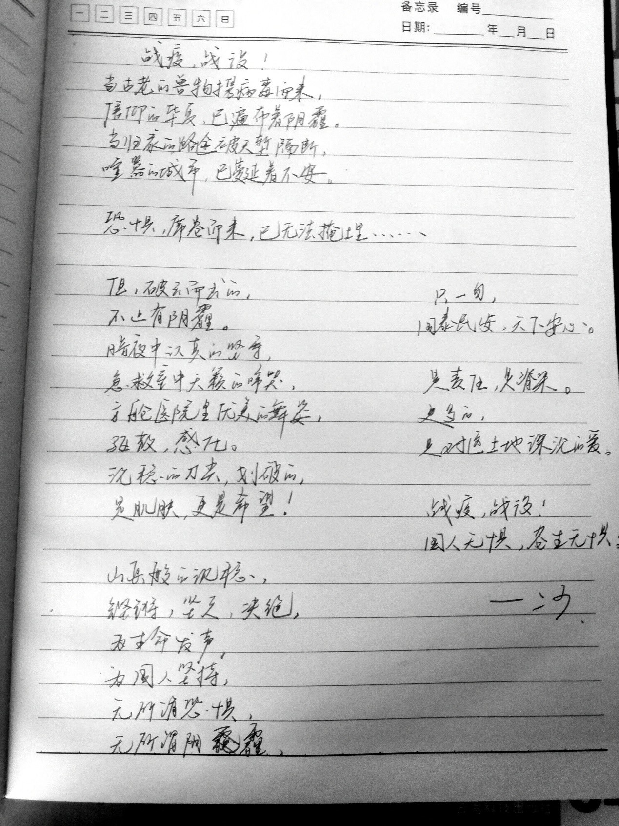 2018级冶金专业的李福申同学在收看直播后,心情澎湃,赋诗一首:战疫,战役!当古老的兽物携病毒而来,信仰的华夏,已遍布着阴霾。当归家的路途被天堑隔断,喧嚣的城市,已蔓延着不安。恐惧,席卷而来,已无法掩埋……但,破云而出的,不止有阴霾。暗夜里认真的坚守,急救室中天籁的啼哭,方舱医院里优美的舞姿,驱散,感化。沉稳的刀尖,划开的,是肌肤,更是希望!山岳般的沉稳,铿锵,坚定,决绝,为生命发声,为国人坚持,无所谓恐惧,无所谓阴霾,只一句国泰民安,天下安心。是责任,是脊梁,更多的,是对这土地深沉的爱。战疫,战役!国人无惧,苍生无惧!