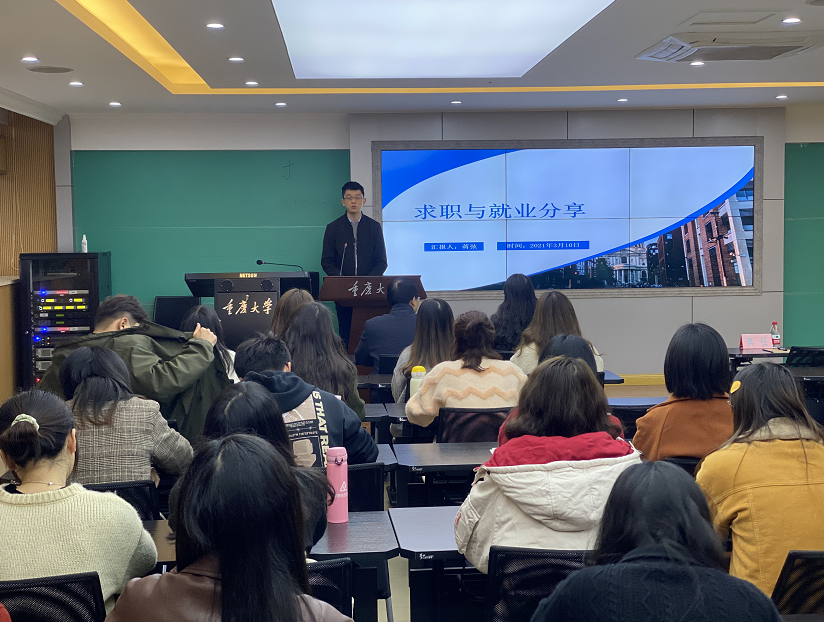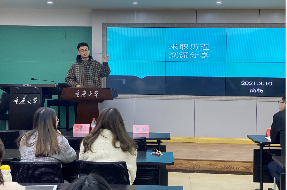随后,四位毕业生依次分享了自己的求职、工作、读博经验,在分享过程中,各位毕业生知无不言,言无不尽,毫无保留地分享了自身的工作以及学习感悟。分享过程中,陈妍西、尚杨、蒋弦三位毕业生详细分享了求职经历、面试技巧、求职方式、求职心态调整等内容,何丽玲分享了考博、应试、复试技巧等内容。座谈的后半部分,各位毕业生与在校同学进行了互动,回答了各位在校同学关于求职选择、读博选择等问题。