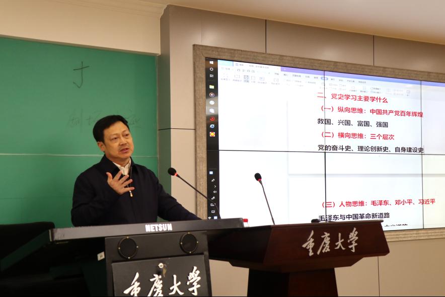 何教授采取纵向思维,分别从中国共产党“救国史”、“兴国史”、“富国史”、“强国史”四个方面展开党史学习教育分享。党的“救国”史方面,何教授以“为什么要建立中国共产党”、“中国出了个毛泽东”以及“打出了一个崭新的中国”为主要内容,深刻论述了建党的紧迫性、必然性和党逐渐成熟的成长道路。党的“兴国史”方面,何教授以社会主义制度的建立为主要学习线索。“富国史”则以邓小平同志与新时期为主要切入点。党的“强国史”方面,何教授着重论述了在党的领导下中国特色社会主义进入了新时代之“新”的含义。最后,何教授总结到,历史和实践证明“只有坚持和发展中国特色社会主义才能实现中华民族伟大复兴”。