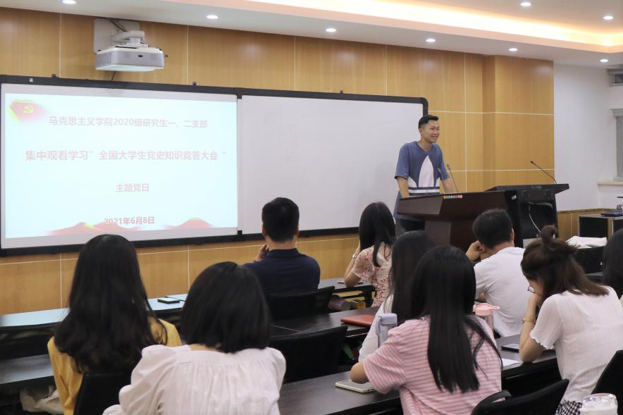 2020级研究生一、二支部在学院412室集中观看学习《全国大学生党史知识竞答大会》。《全国大学生党史知识竞答大会》是由中央广播电视总台策划发起的学党史类节目。节目以演播室现场百人团、全国2800多所高校大学生的线上线下互动,开展党史知识竞答。我院2020级研究生雷洪鸣作为天天看小说
