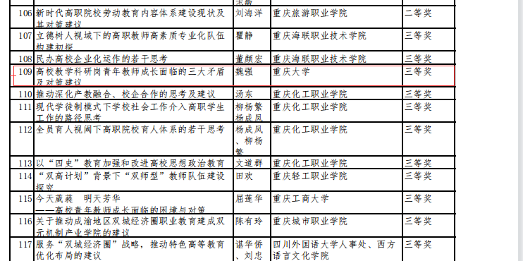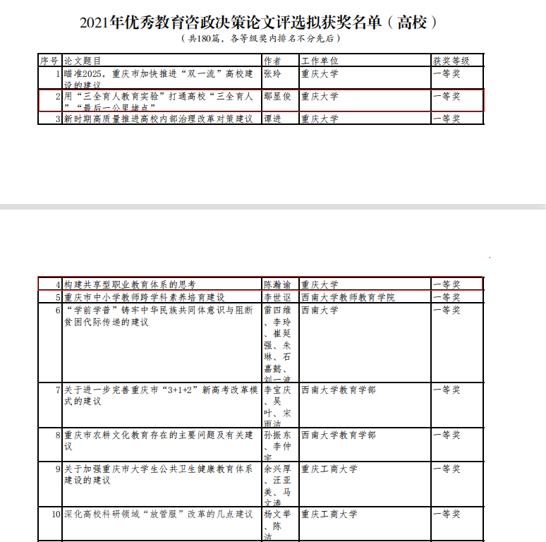 近日,重庆市教育委员会公布了2021年教育咨政决策论文获奖名单,天天看小说 鄢显俊教授撰写的《用“三全育人教育实验”打通高校“三全育人 ”“最后一公里堵点”》一文,青年教师陈瀚谕撰写的《构建共享型职业教育体系的思考》一文荣获一等奖,魏强副教授撰写的《高校教学科研岗青年教师成长面临的三大矛盾及对策建议》荣获三等奖。