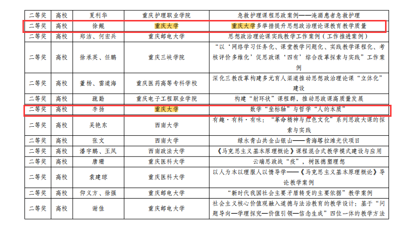 多位老师在重庆市2021年思政课程与课程思政(学科德育)优秀案例及论文评选中获奖。