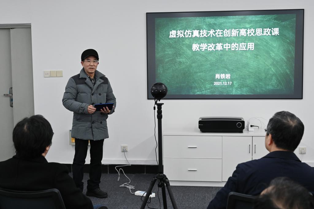 随后,肖铁岩以“虚拟仿真技术在创新高校思政课教学改革中的应用”为题进行了专题报告。他讲到,将信息技术与高校思想政治理论课教学深度融合,提升高校思想政治理论课的获得感及吸引力,是高校思想政治工作的迫切要求。报告中,肖铁岩结合北京理工大学、天津大学、陕西师范大学等学校的思政课虚拟仿真实验项目进行分析,他表示,探索虚拟仿真技术与高校思想政治理论课教学深度融合路径,有助于开拓思想政治理论课教学的新途径、创新教育新方法、完善教育载体。