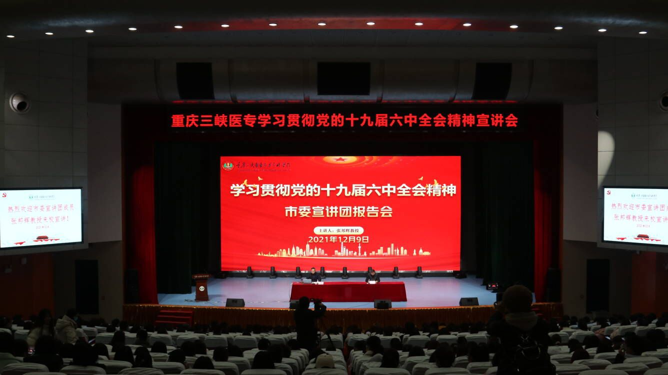 院长张邦辉教授作党的十九届六中全会精神宣讲报告。重庆三峡医药高等专科学校全体校领导,学校副处级以上干部,整合后的附属人民医院、附属中医院主要负责人,党员教师、学生代表共计800余人参加本次宣讲会。重庆三峡医药高等专科学校党委副书记冉隆平主持报告会。