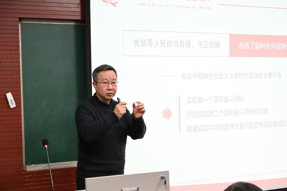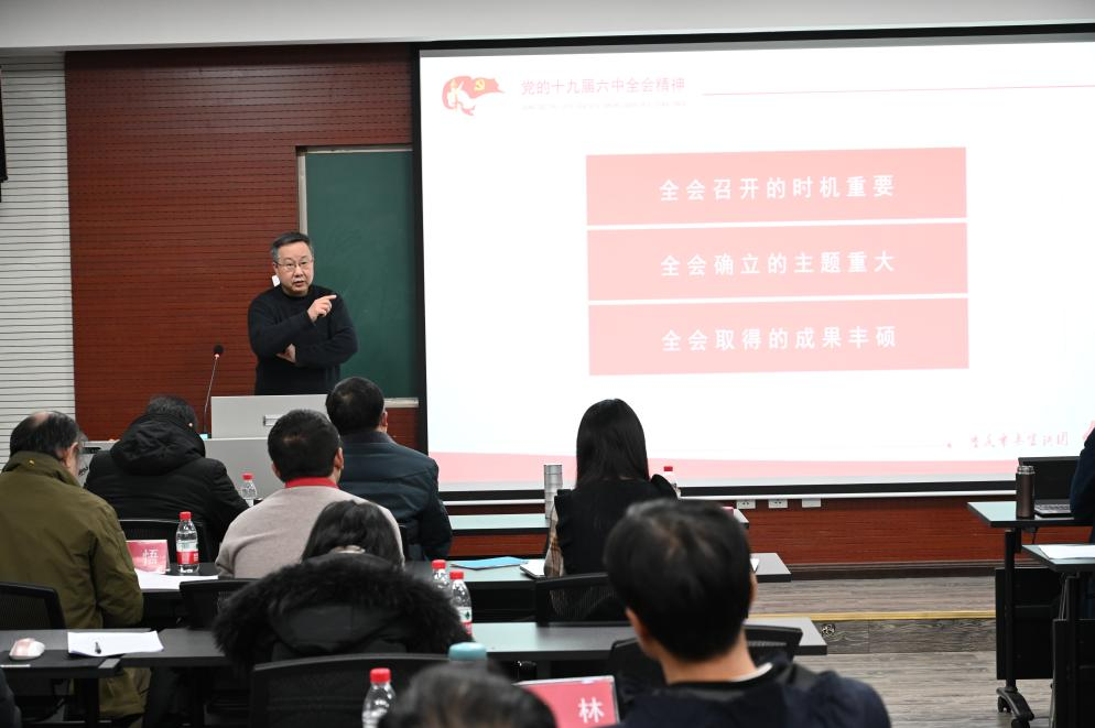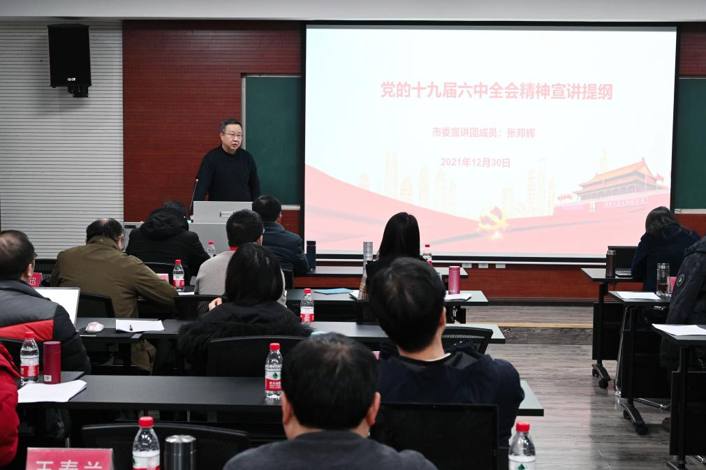 院长张邦辉为学院全体教职工宣讲党的十九届六中全会精神,学院党委书记罗滌、副院长徐鲲、吕进、副书记温健琳出席会议,学院近70余名师生参加宣讲会。