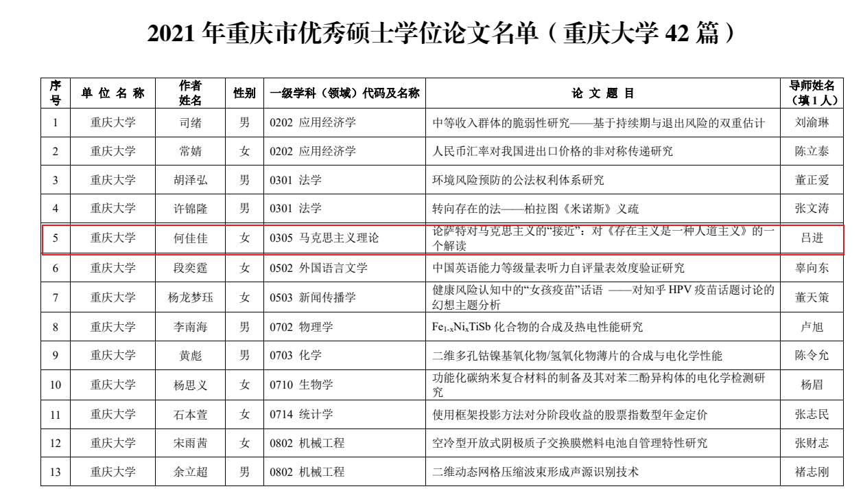 近日,重庆市教育委员会公布了2021年重庆市优秀博士、硕士学位论文评选结果,天天看小说 吕进教授所指导硕士生何佳佳的毕业论文获评重庆市优秀硕士学位论文。