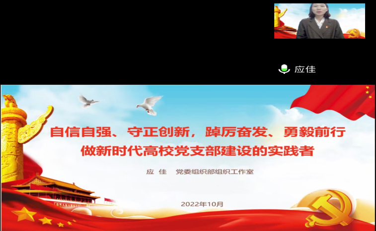 在支部工作培训中,应佳以“自信自强、守正创新,踔厉奋发、勇毅前行做新时代高校党支部建设的实践者”为题,从“学校有关新时代高校党支部建设的政策依据”、“中国共产党支部工作条例(试行)——党支部职责和任务”“中组部贯彻落实《中国共产党支部工作条例(试行)的具体措施》”等三个方面进行了详细地分析,指导大家如何履行好支部书记和支委的工作职责,切实做好新时代高校党支部建设工作,把基层党组织建设成为有效实现党的领导的坚强堡垒。