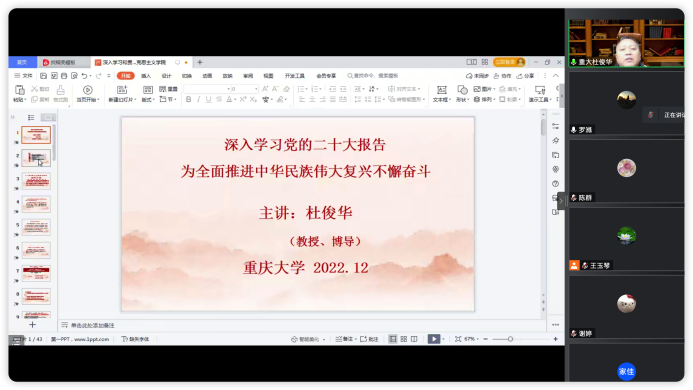 通过腾讯会议开展党的二十大精神宣讲,邀请杜俊华教授进行专题宣讲。会议由学院党委书记罗滌主持,马院师生积极参加。