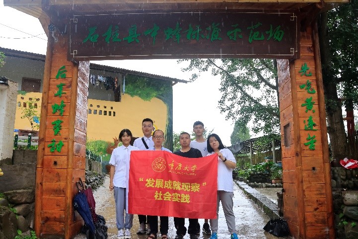 行走在中益乡,路灯、垃圾桶等随处可见蜜蜂形状的图案,这是中益乡所推广的“中华蜜蜂小镇”品牌。中益乡围绕创建“中华蜜蜂小镇”,大力发展吴茱萸、盐肤木等木本药材及脆红李等蜜源植物,因地制宜打造“花卉种植+中蜂养殖+精深加工”产业链,现已饲养中蜂8000群。实践团成员在当地向导的带领下,来到了盐井村“养蜂大王”陈小平位于悬崖之上的蜜蜂养殖基地。在交流中,陈小平表示,在党的政策支持和专家团队的指导下,自己的蜜蜂养殖事业越来越红火,从原先的小规模养殖到现在上千群的规模,未来还将继续发展与周边村镇的合作、扩大产业规模。