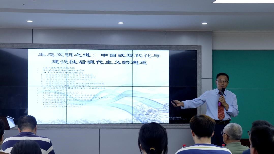 学院党委书记陈科对王治河研究员的到来表示热烈欢迎并对其学术成就做了相关介绍。随后,王治河研究员以“走下神坛的西式现代化”入题,分析了当今国际社会中西式现代化面临的困境及其哲学原理,从而提出生态文明亟需中国式现代化的中心论点。紧接着他从中国式现代化何以推进生态文明、中国式现代化与建设性后现代主义的深度妙合以及如何活出现代化三个方面展开详细论述。