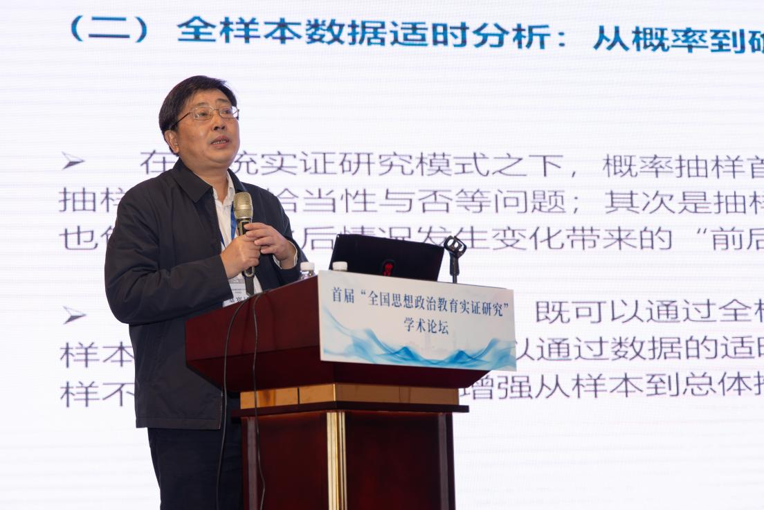 院长吴满意教授作题为《数字化文本:大数据时代思想政治教育实证研究的基石》的主旨报告。他指出“数字化文本”作为大数据时代思想政治教育实证研究的基石,具备建构性、全息性、叠加性和多元性等特点,主张通过数字化文本构建实证研究的生产链和计算链,形成思想政治教育实证研究的价值链,实现思政教育中场景、图景、情景相统一。