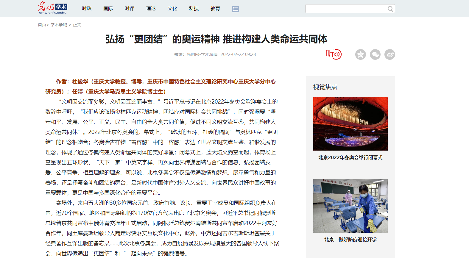 杜俊华教授及其博士生任婷在光明网“光明学术”专区发表《弘扬“更团结”的奥运精神 推进构建人类命运共同体》一文,引发广泛关注。