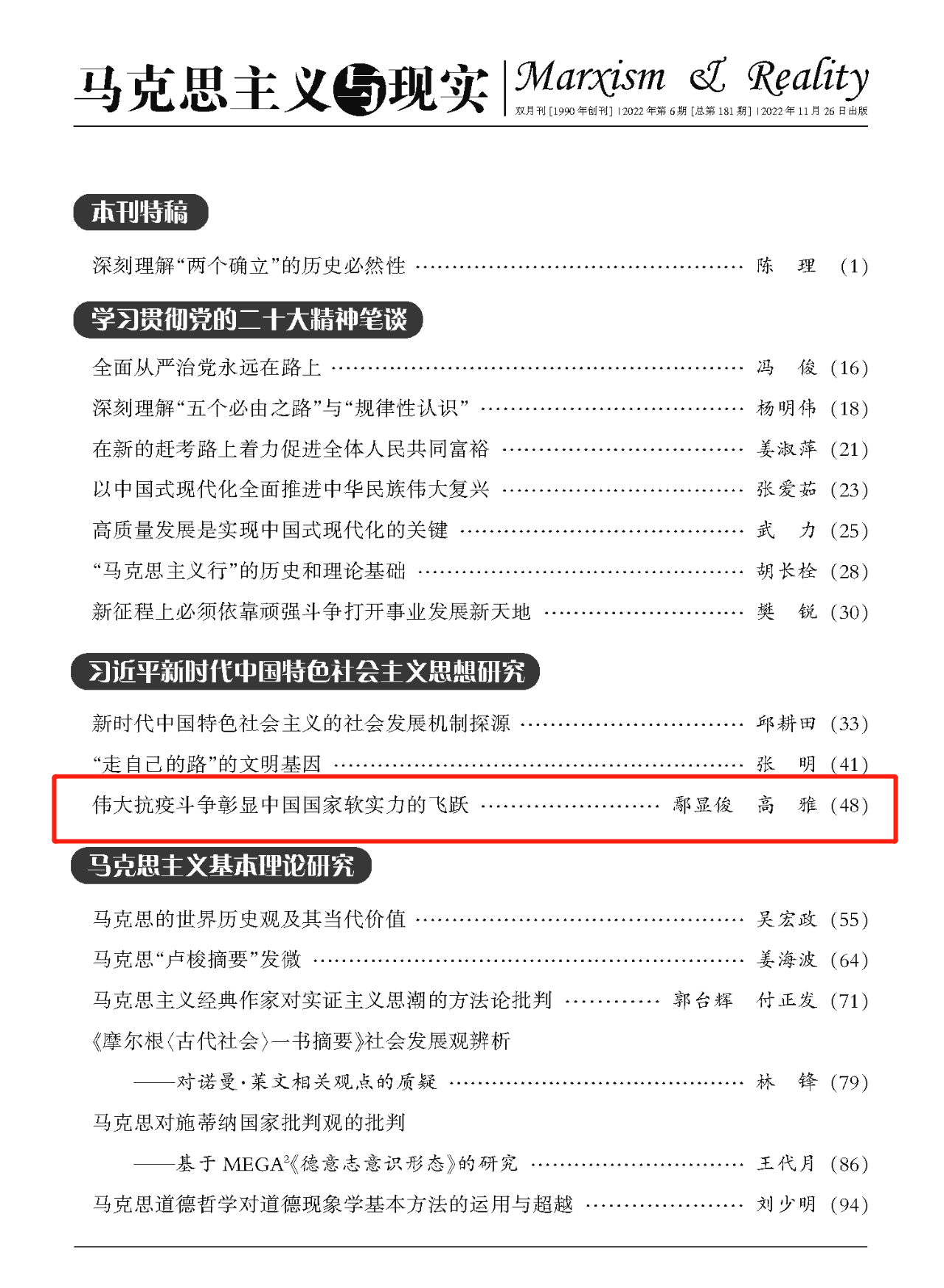 校定A刊论文。该文指出,伟大抗疫斗争是以习近平同志为核心的党中央领导全国人民抗击新冠肺炎疫情的全民战役,中国人民戮力同心,团结一致,依托优越的政治制度和强大综合国力,夺取了重大战略成果,彰显了举世瞩目的中国国家软实力。这场斗争充分展示中国国家软实力之治国理政的科学思维特征和政治制度的优越性,其中科学思维特征集中凸显了习近平新时代中国特色社会主义思想的辩证、底线和斗争思维特征,政治制度的优越性则具体表现为:领导人担当精神、全国一盘棋集中力量办大事制度、超强的危机管控能力、科学民主决策程序四个要素强强联合后形成强大合力。而伟大抗疫精神则是中国国家软实力之文化凝聚力的精彩绽放。中国抗击新冠肺炎疫情的经验昭示:以习近平同志为核心的党中央坚强领导是中国国家软实力在伟大抗疫斗争中得以充分体现并震撼全球的根本原因,而“两个确立”是促成中国国家软实力飞跃的深刻根源。