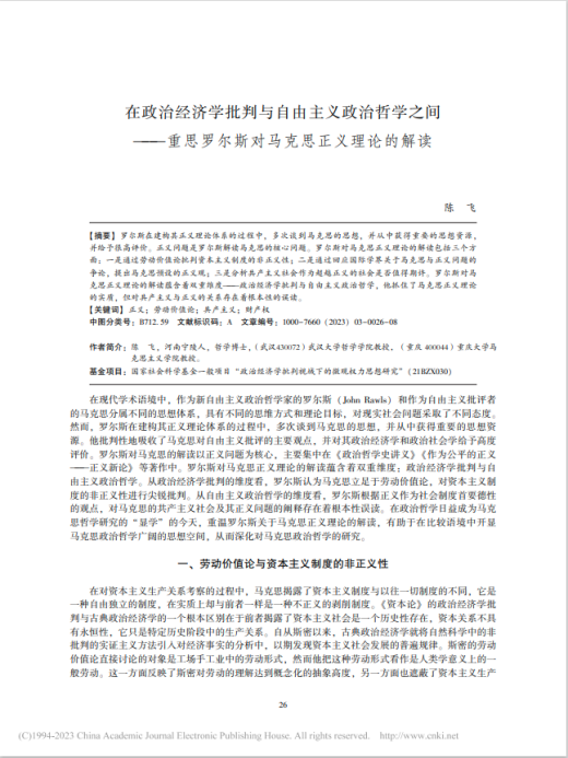 陈飞教授在《现代哲学》上发表论文《在政治经济学批判与自由主义政治哲学之间——重思罗尔斯对马克思正义理论的解读》