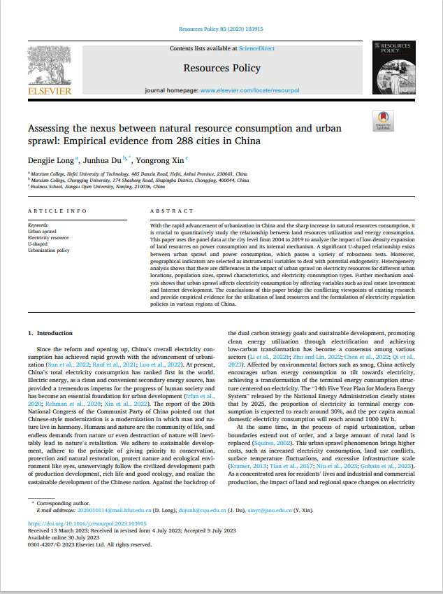 我院杜俊华教授(通讯作者)阐释能源资源的英语论文《Assessing the nexus between natural resource consumption and urban sprawl 》,发表在SSCI一区外文期刊《RESOURCE POLICY》2023年第8期上。该期刊也是JCR一区论文,影响因子5.634。该文认为,城市扩张与电力消耗之间存在显著的 U 型关系;不同的城市地理位置、人口规模、城市扩张特征以及不同的电力消费类型,使城市扩张对电力资源的影响存在差异。这为中国的土地资源利用和电力监管政策的制定提供了一定的经验。