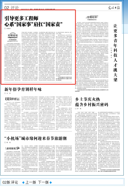 2024年2月21日,我院杜俊华教授在《光明日报》第2版光明论坛上发表文章——《引导更多工程师心系“国家事”肩扛“国家责”》。