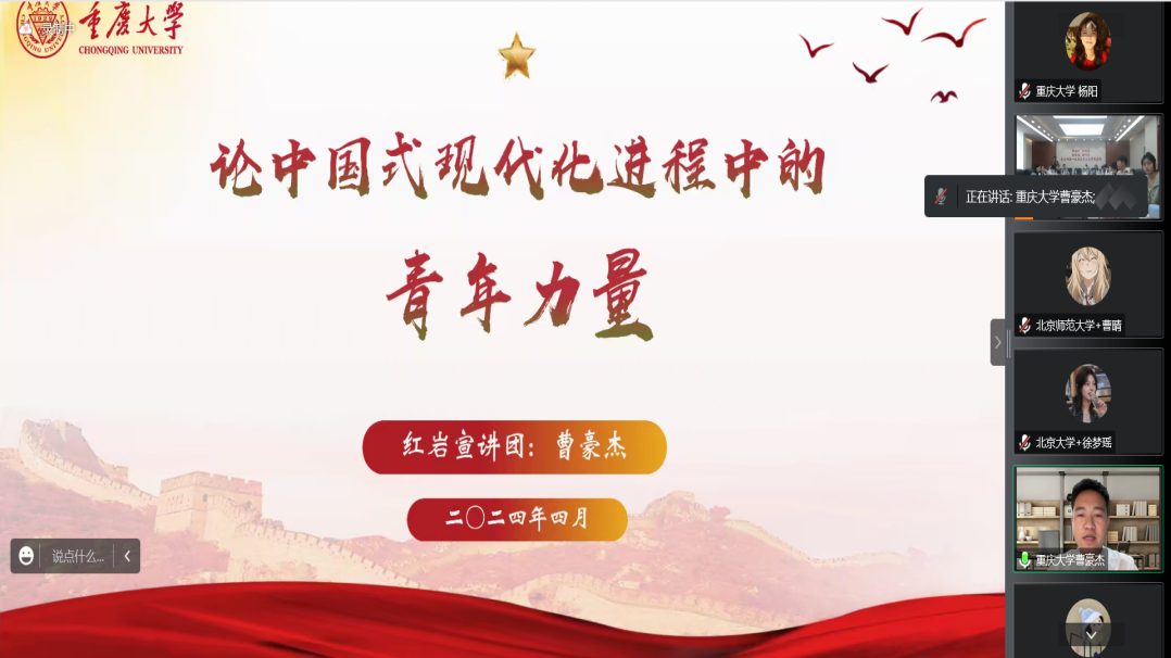 On April 28, 2024, the Red Revolutionary Spirits Propaganda Group from the Marxism School of Chongqing University was invited to participate in the "Study Ideology • Youth Voice—the 2rd Joint Study and Lecture Event among Universities Included in the 'Double World-Class Project'." This event was hosted by the Marxism School of the University of Electronic Science and Technology of China, promoting the May Fourth Spirit and deeply studying Secretary General Xi Jinping's views on the youth.The event brought together student representatives from Peking University, Beijing Normal University, Zhejiang University, Sichuan University, Wuhan University, Chongqing University, Hunan University, and China Agricultural University for a joint lecture. The purpose of this event was to commemorate the 105th anniversary of the May Fourth Movement, guide youth in promoting the May Fourth Spirit, and encourage them to undertake the mission of the era.